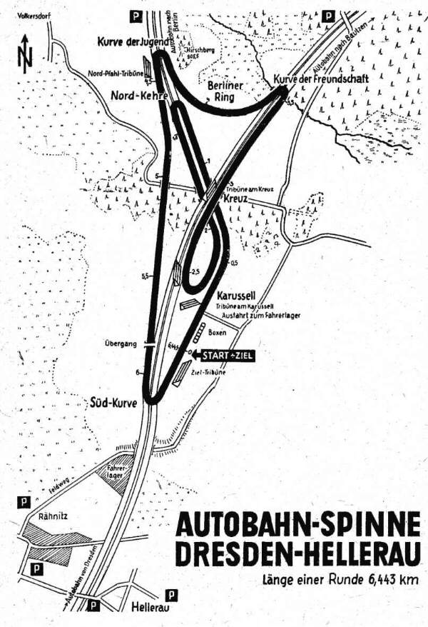 Die Idee, den Bereich des Autobahndreieckes Dresden-Nord als Rennstrecke zu nutzen, schreibt man dem Cossebauder Rennfahrer Helmut Zimmer zu. Durch die Schaffung einiger fester Übergänge über den Grünstreifen kam es zu einer Rennstrecke, die schließlich aufgrund ihrer Streckenführung die Bezeichnung „Autobahnspinne“ erhielt. Die relativ gut erhaltene Autobahn-Zementdecke galt zu dieser Zeit als ein fast idealer Fahrbahnbelag für Rennsportzwecke. Mit einer Streckenlänge von 6,443 km (später 5,3km) entsprach sie den damals üblichen Distanzen für Rundstrecken.